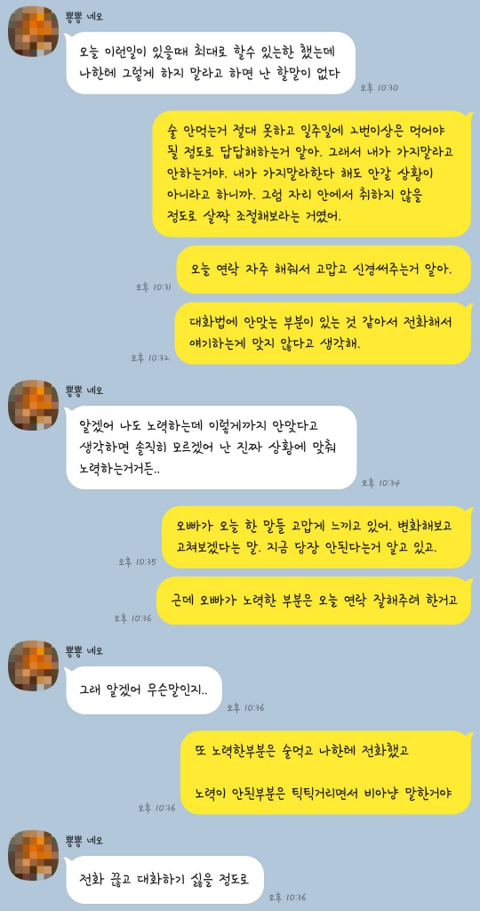 상황은 저번에 술먹고 연락을 잘 하지않아서 잘하겠다 약속을 했고 오늘 그래도 자리옮길땐 연락했다며 노력했다는 상황이에요. 술자리에서 연락할때 술을 먹고 커피마시고 있다는 연락을 했고, 갑자기 3차로 또 순댓국에 술을 먹고 발음이 살짝 꼬일 정도로 먹읒 상태였어요. 그리고 결혼이 반년정도 남은 연인입니다.