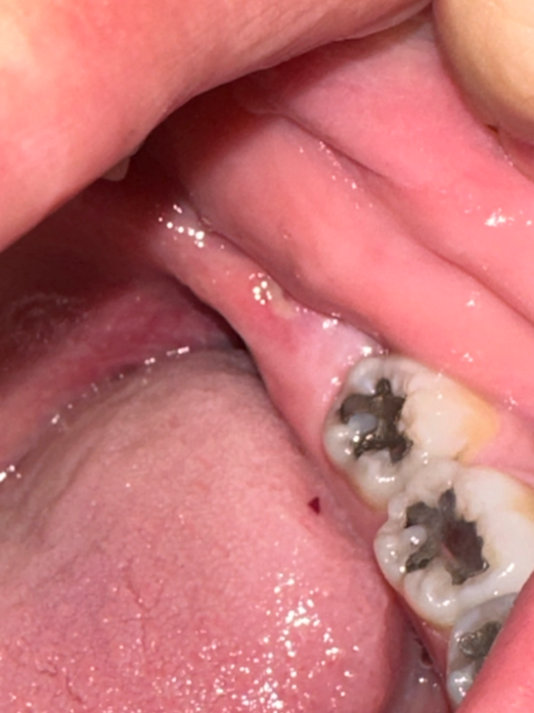 현재 사진상 구내염 의 가능성 및 잇몸 염증의 가능성이 있습니다. 소독용 가글액인 탄툼가글액을 사용하여 보길 권하며 해당 부위 통증 및 붓기가 더 심해지는 경우 치과 진료를 받아보길 바랍니다.