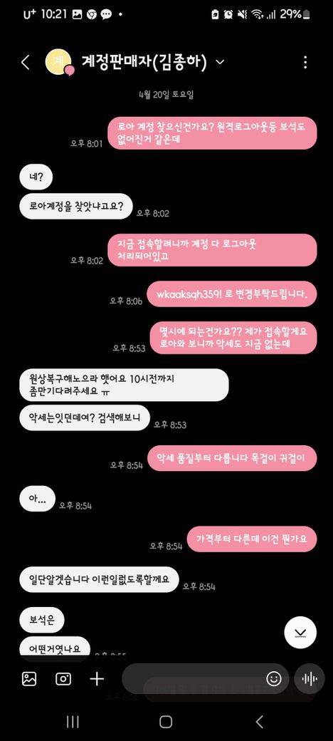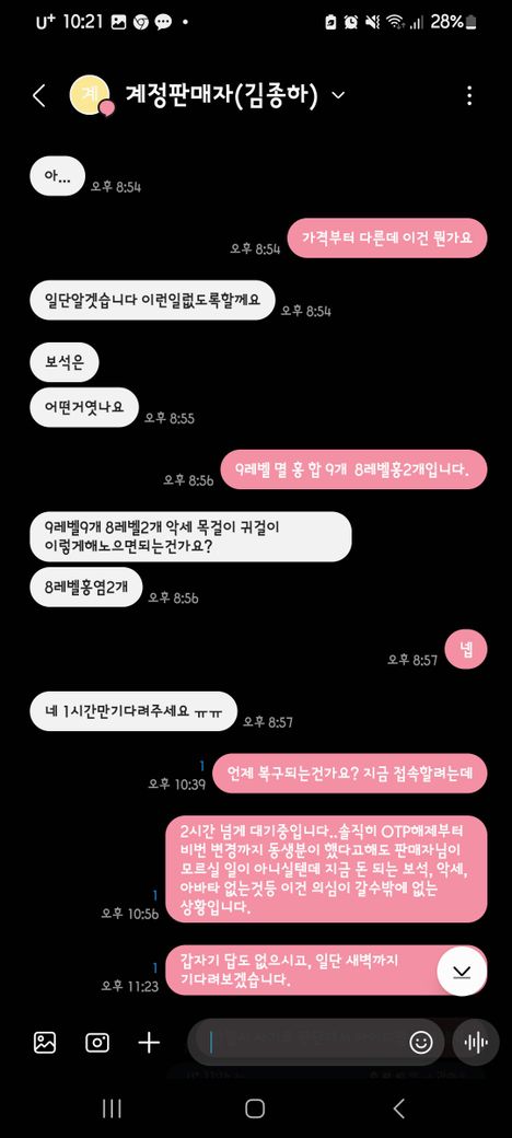 OTP 설정으로 해킹은 전혀 걱정이 없어서 이건 판매자가 회수를 했다고 생각되서 문자를 보내니 바로 전화가 걸려와서 자기 동생이 한것이라고 설명후 자기는 몰랐다고 미안하다며 22시까지 복구를 해주겠다고 사과후 전화를 끊고, 아래 사진과 같이 문자로 대화후 지금까지 묵묵부답입니다.