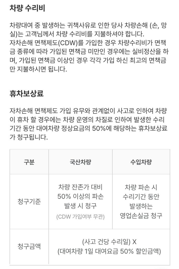 3. 저희가 빌린 차량에 대해선 휴차료 또는 차량 수리비에 대해 자기부담금이 발생할까요?