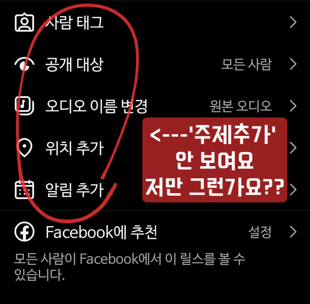 릴스 올릴 때 마지막에 메뉴 중 '주제추가'에 들어가서 3가지 선택한 후 올렸었어요.