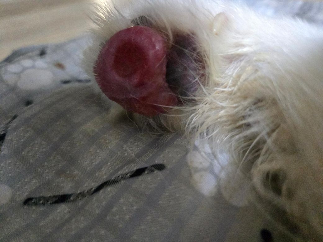 병원에서는 무언가 잘못 밟아 생긴 상처에서 생긴 염증 및 계속 발을 핥아서 악화된 습진이라고, 바르는 약 정도를 처방해주었습니다.