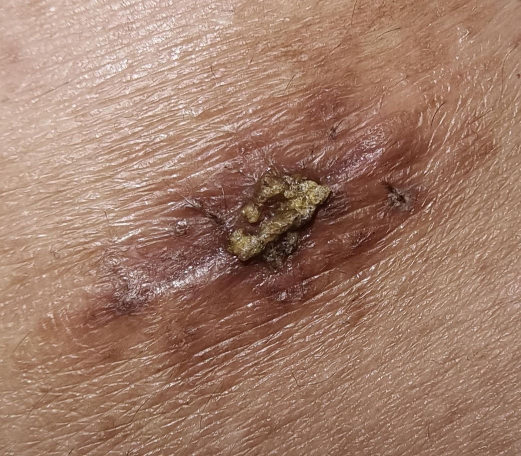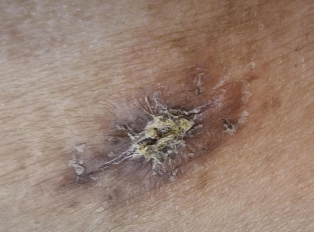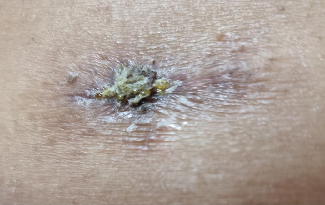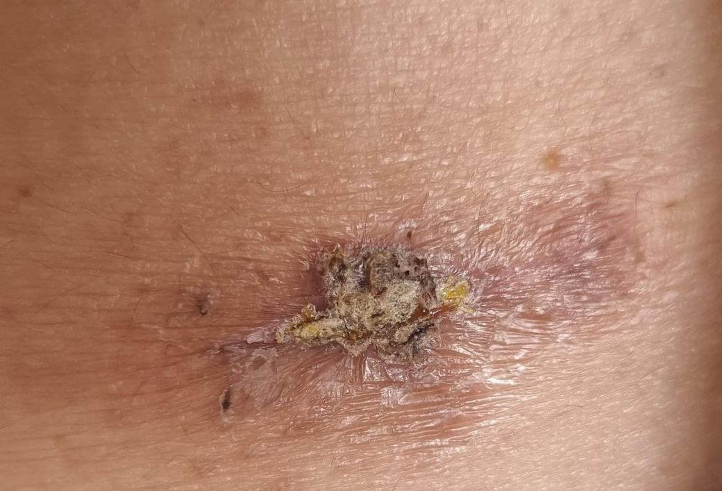 딱지는 안 떨어지고 진물이 나서 딱지가 굳는 게 점점 커지다보니 딱지때문에 안에 살이 안 아물고 진물이 빠져나갈 틈만 있으면 나가려다 공기에 굳고 안쪽으로는 진물이 계속 나오고있는 거 같아서 불안합니다