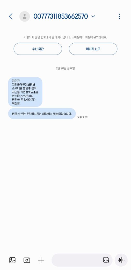 해외에서 발송된 점을 고려하면 스팸 문자일 가능성이 높고 연락을 취하지 말고 차단하시길 바랍니다. 이상입니다