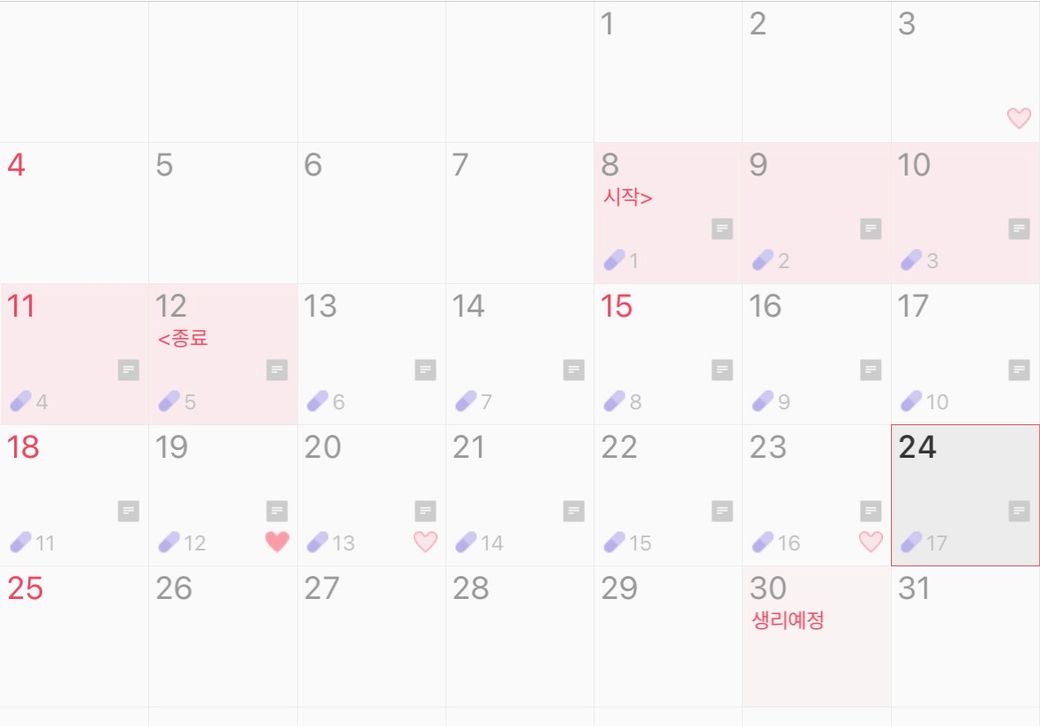 8월 생리 예정일은 8/3이었고 5일 뒤인 8/8 생리 시작일에 오후 10시 정각에 경구피임약(멜리안) 첫 복용 시작했습니다.평소 생리와 같이 8일 첫날부터 양이 많았고 5일 정도의 생리기간, pms, 생리통 또한 있었기에 정상 생리라고 판단됩니다.