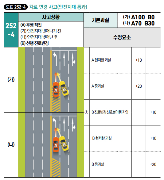 상기 도표를 보면, (가) 도표는 안전지대를 통해 직진중인 차량의 과실이 100% 입니다.