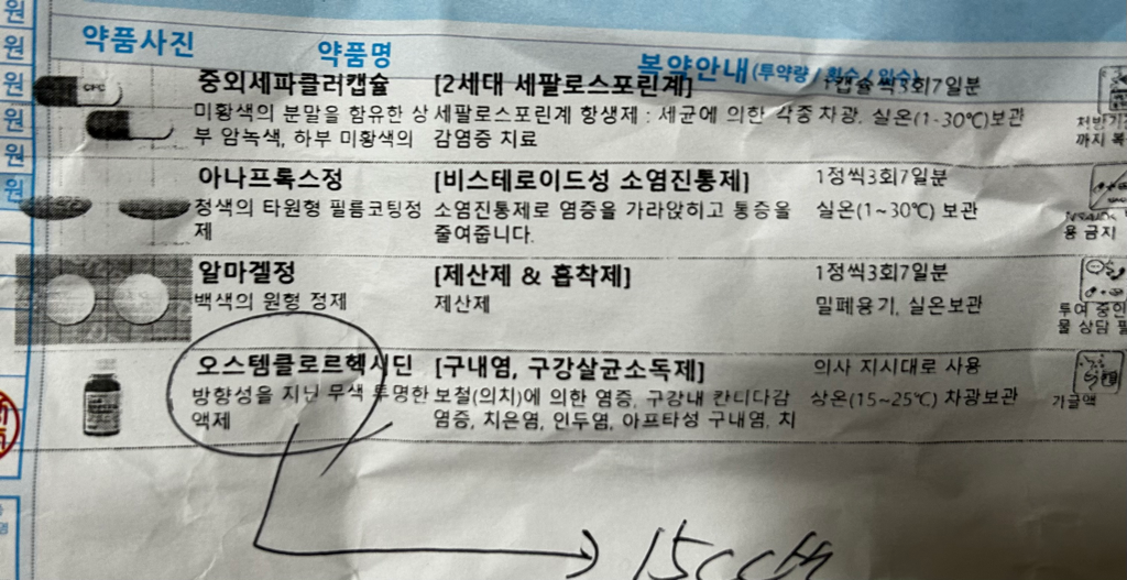 밑에 약 드시면서 위의 약 중에 아나프록스랑 가글만 같이 해주시면 됩니다. 나머지는 안드셔도 괜찮습니다.