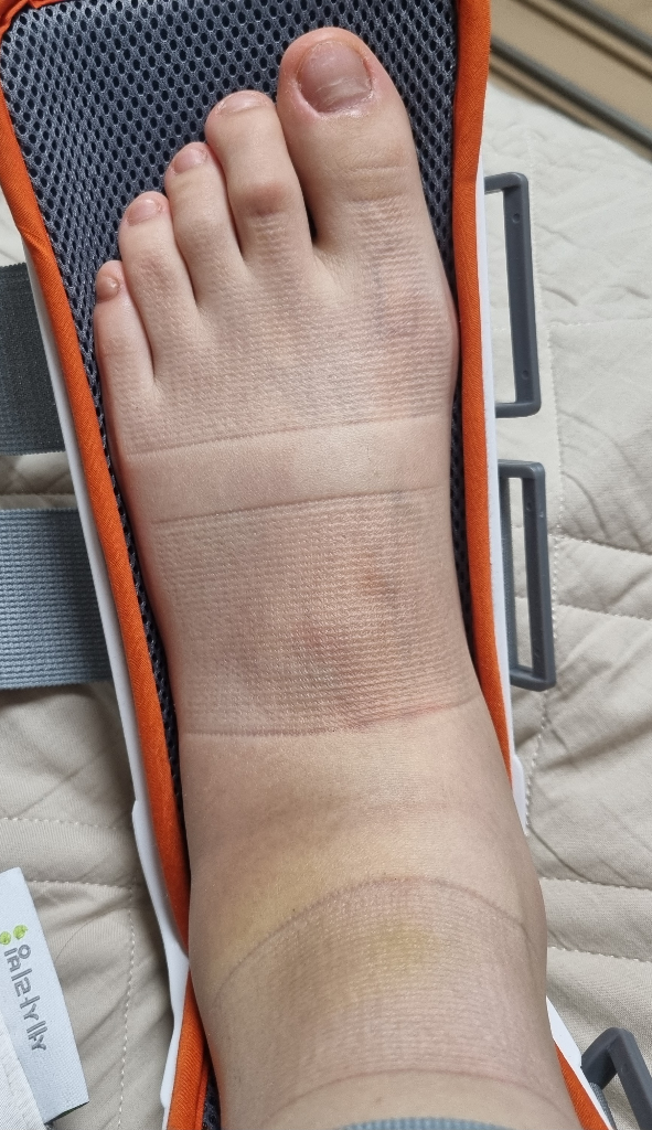 인대가 파열될 정도의 심한 부상은 부종을 흔히 동반합니다. 부종이 심했던 경우 빠지는데에도 상당한 기간을 필요로 하게 됩니다. 고정을 잘 해두시는 것이 가장 중요한 치료이니 다리 사용을 자제하며 기다려보시기 바랍니다.