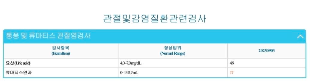 피검사서 요산수치는 정상범위이나 류마티스