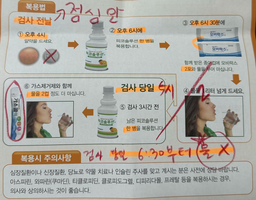 안내 받으신 데로 저녁 6시에 피코솔루션 한병, 6시30분에 모비락스 2포와 물을 종이컵에 부어 마신 후 추가로 2리터 가량의 물을 추가로 마셔야 하는데 한번에 마시는 것은 어렵기 때문에 몇 시간 간격으로 나눠 마시고 물 마시기가 어렵다면 보리차나 이온음료로 대신 마시는 것도 가능합니다.
