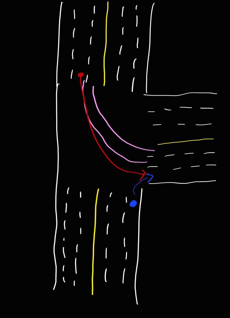 그래서 저도 우회전을 하는데 제가 3차선에 다 진입하고 나니 뒤에서 좌회전차량(빨간점)이 저에게 클락션을 울렸습니다.