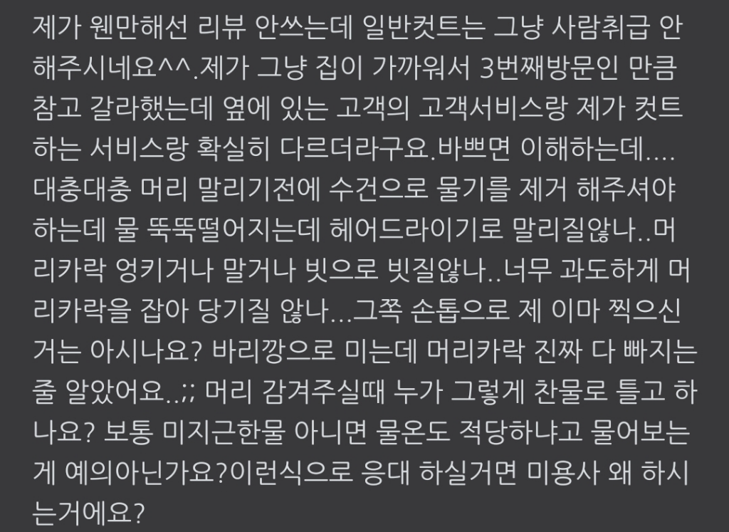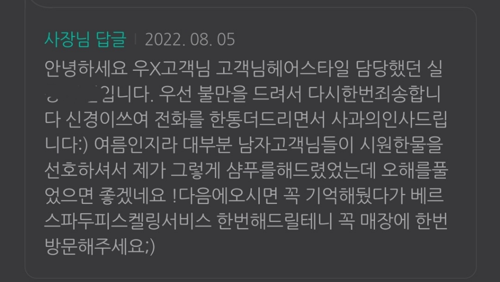 우선적으로 사과하는건 마음이 좀 풀리는데 "대부분 남자고객님들이 시원한 물을 선호하신다"라고 되어있는부분이 이해가 않가네요.아무리 똑같은 남자라지만 그 사람의 두피상태나 두피가 예민 할 수도 있는 문제인데 바로 찬물을 끼얹고 샴푸하고 하는 행동이 맞는가 싶어요.그리고 다음에 방문을 해돌라 하는데 누가 가고싶겠습니까...