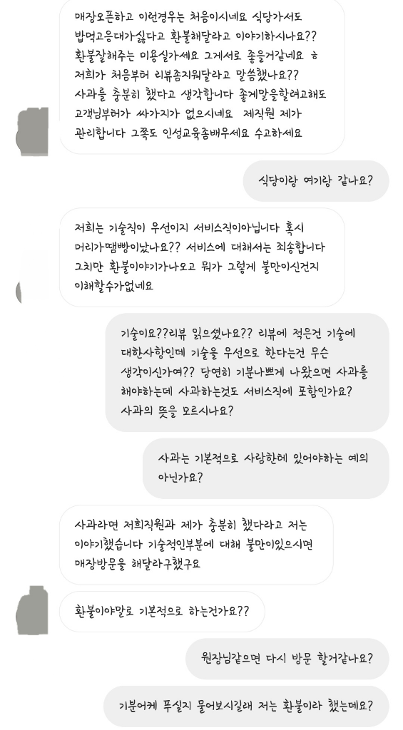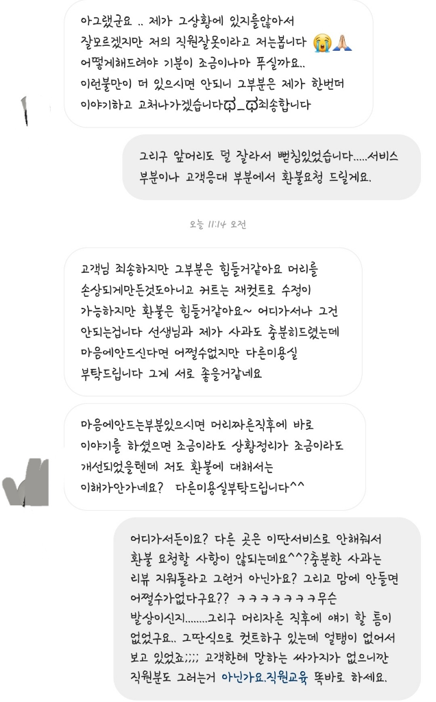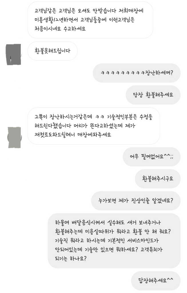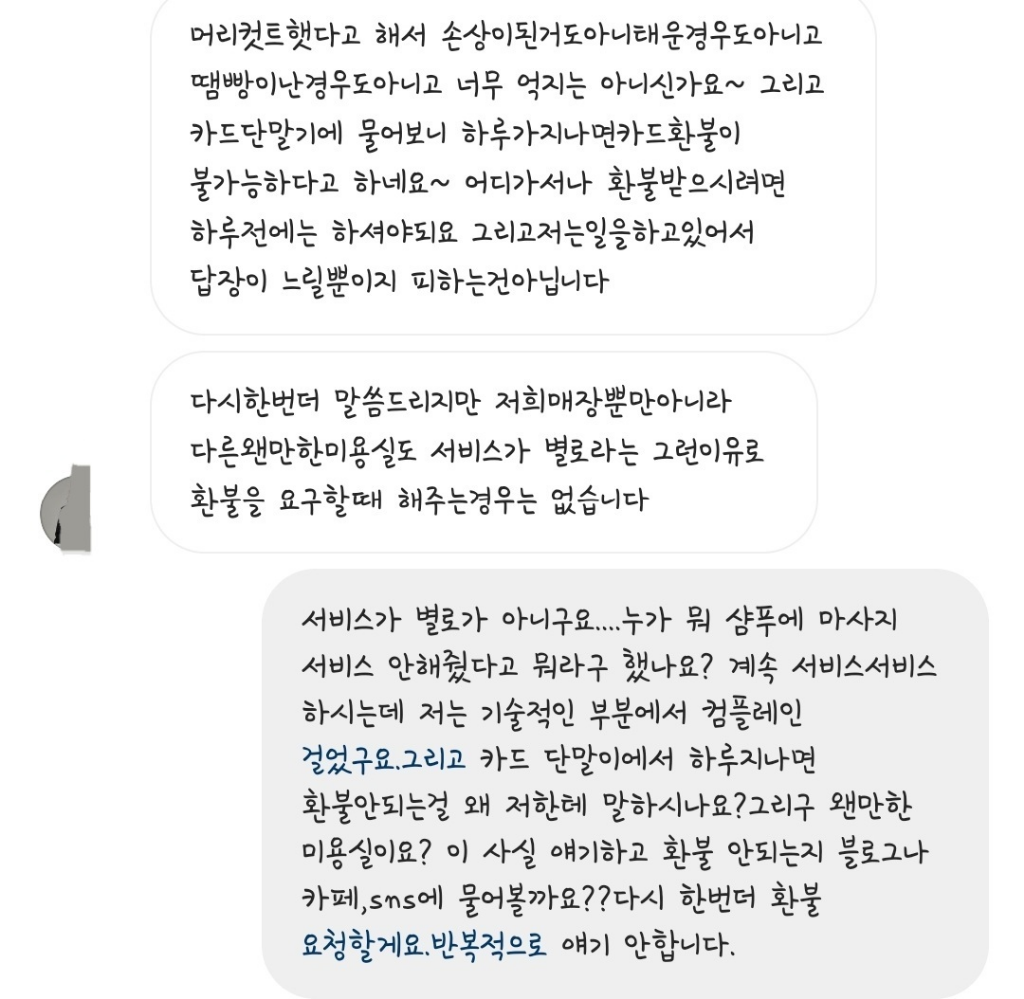 무척 화가나 있는 상태이구 원장님이 어떻게 하면 화를 풀 수있냐 물어보길래 저는 환불요청을 당당하게 했죠.제가 지금 이런상황까지 올줄 몰라서 머리카락 사진을 못찍었는데 너무 대충 자르셔서 뻗침 현상이 있었습니다.집에서 가위로 다듬는 다고 사진을 못찍어 뒀습니다.환불 요청했는데 안된다고 하구요.저렇게 디엠으로 말이 오가다가 영수증 얘기가 나왔습니다.카드단말기가 하루지나면 환불 못해드린다고도 말씀하시구요..영수증이 있어야 해준다.지참해서 매장와서 환불받아라고 하시는데 영수증을 받은 적이 없거든요??그러고 읽고 씹으셨다가 결국에는 차단한거 같은데 이 경우는 환불어떡해 받아야하나요?? 고소도 가능한가요??