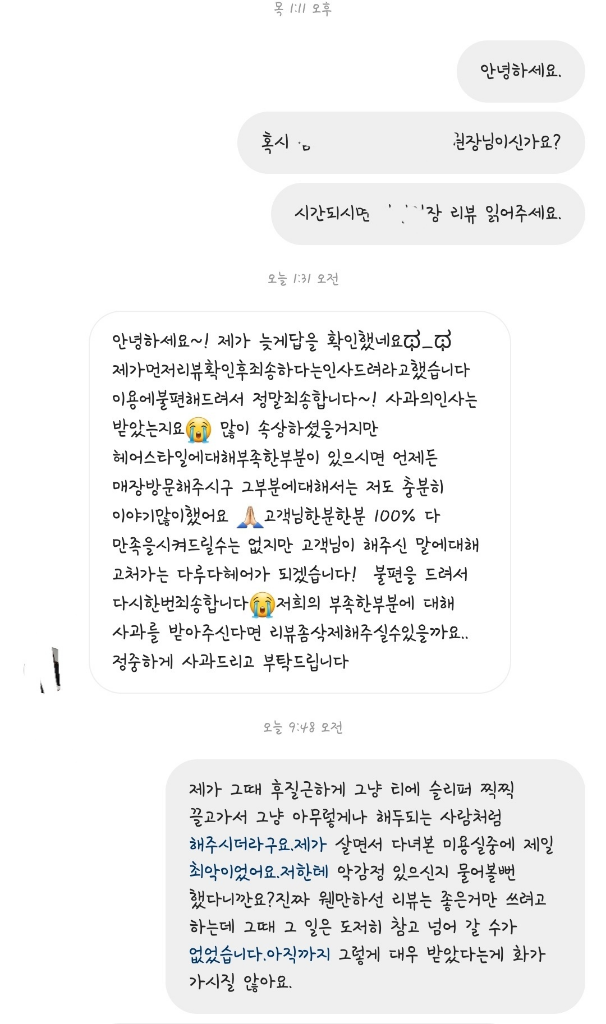 리뷰에서 작성했던거 처럼 저 한테 응대를 했습니다.그래서 도저히 참을 수가 없어서 리뷰를 썼죠...그러고 30분뒤에 실장이 다짜고짜 전화와서 리뷰보고 사과를 하는거에요.머리카락은 괜찮냐 뭐 등등 물어봤는데 화가나서 그냥 다 괜찮다고 하고 빨리 끊었죠....그러고 이 일은 원장님이랑 얘기 해야 할거같아서 인스타그램 디엠으로 이렇게 보냈어요.