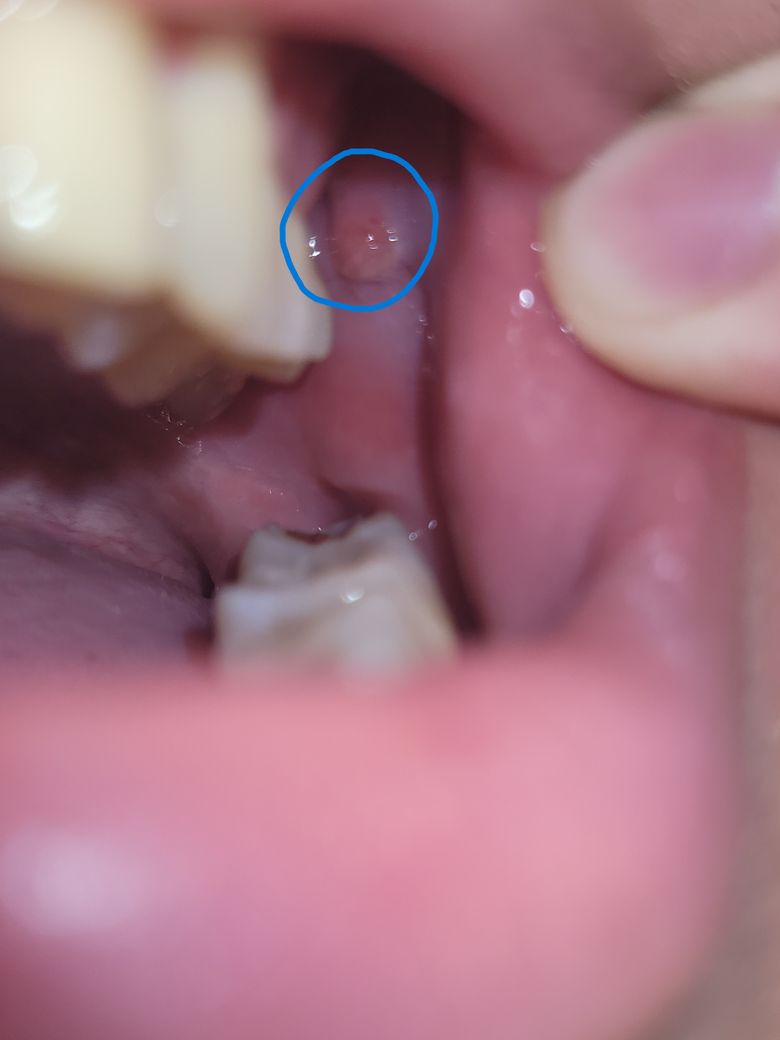 사진에서 볼 수 있는 것 처럼 양쪽 어금니(사랑니 앞 어금니와 그 앞 치아 사이)에 살이 튀어나와 있습니다.