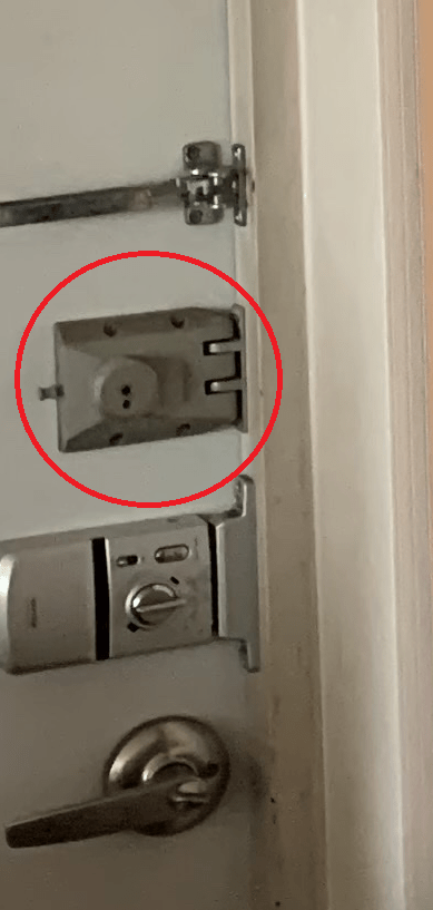 현재 상태는 가장 아래의 현관문 손잡이 및 열쇠잠금장치만 그대로인 상태이고, 그 위의 도어락(약 10년 전 구매 당시 16만원 상당)은 건전지 커버 분실, 상기한 빨간원의 잠금장치는 저희와 상의없이 업체 측에서 제거 후 분실, 그 위의 방범 안전걸이는 제거된 상태, 사진에 나오지 않은 현관문 하단의 말발굽 문 스토퍼도 제거된 상태입니다