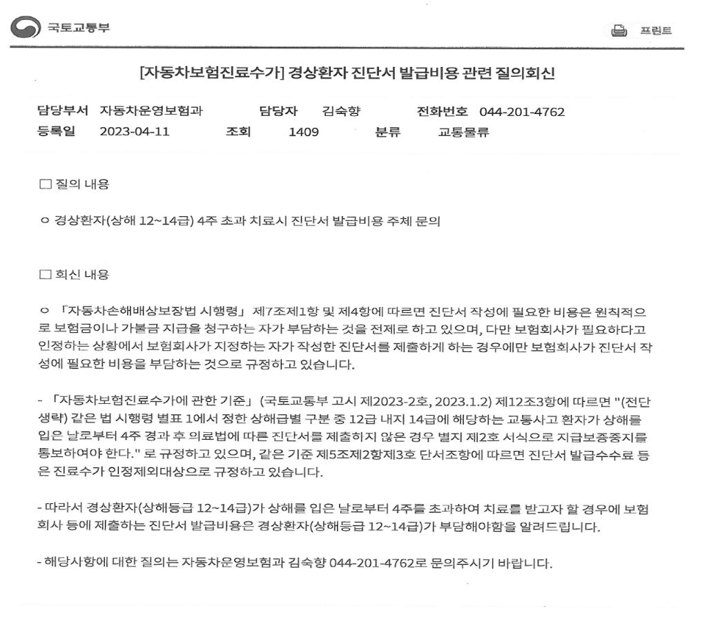 신호등없는 횡단보도보행자사고 과실0% 피해아동 보호자입니다 4주이후 추가진단서 발급비용 피해자가 지불해야하나요?
