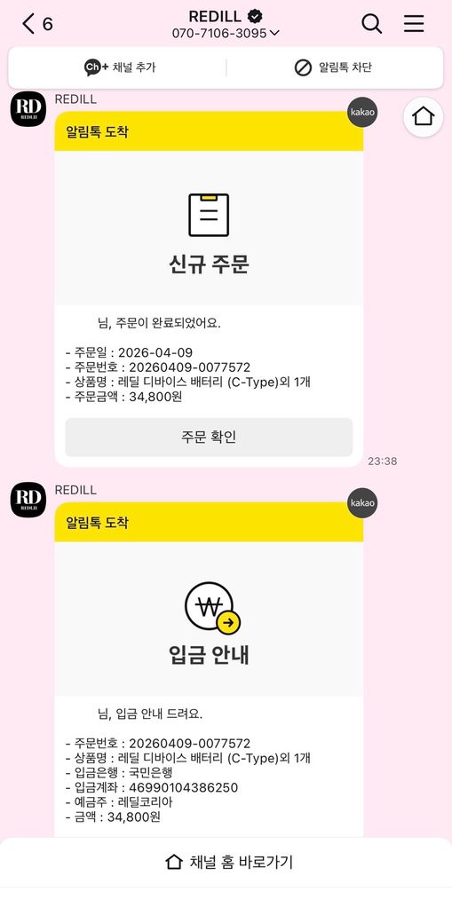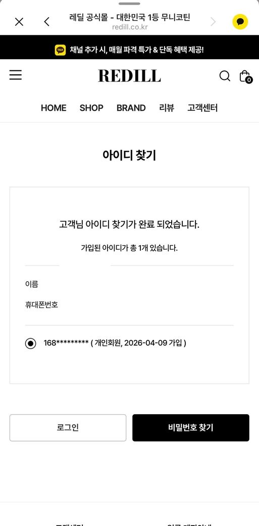 REDILL이라는 전자담배 사이트에 제 이름으로 로그인 및 상품 주문이 되었습니다