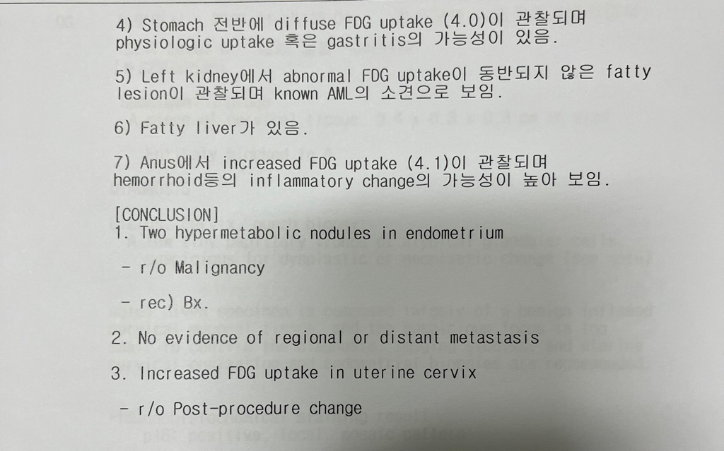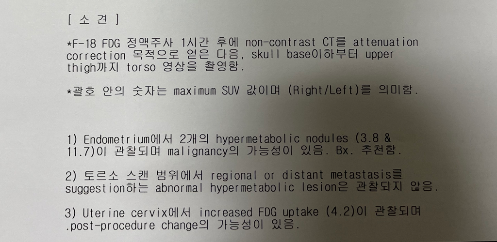 근데 제가 brca 유전 변이가 있다보니 교수님께서 전이가 걱정되셨는지 조직검사 일주일 뒤로 MRI와 PET-CT날짜를 연달아 바로 잡아주셨어요. 이번주에 조직검사 결과가 나왔는데 자궁경부조직검사 결과상으로는 자궁경부에서는 암세포가 보이비 않는다고 하시면서 자궁내막암을 의심하시더라구요. 자궁내막조직검사를 할려면 수술을 해야해서 날짜는 일단 MRI와 PET-CT 결과를 보고 수술일정을 잡기로 했는데 제PET-CT 소견이 어떤가요?