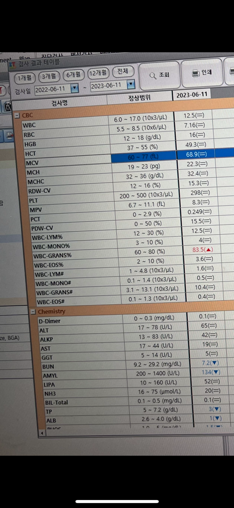 혈액검사 수치상으로는 혈소판 수치나, 감염에 대한 결과는 떨어져 보입니다.