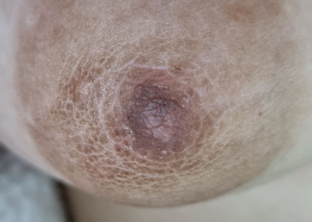 유두나 유륜에도 습진과 같은 피부질환이 발생할 수 있습니다. 유방외과나 피부과에서 진료를 받아보시고 치료받으시기를 권해드립니다.