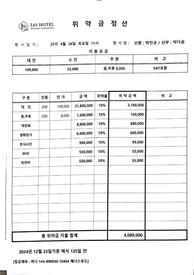 이번에 파혼하게 되면서 12월22일날 웨딩홀에 전화를 했고 웨딩홀 에서 계약금 환불 안되고 위약금도 내라는 통보를 받았습니다.