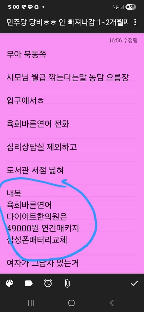메모장에 파란색 동그라미로 표시한 항목들(내복, 육회·바른연어 같은 음식, 다이어트 한의원, 초원성경 앱 연간 패키지 49,000원, 삼성폰 배터리 교체)을 적어두었는데, 막상 무엇을 먼저 사야 할지 헷갈립니다.