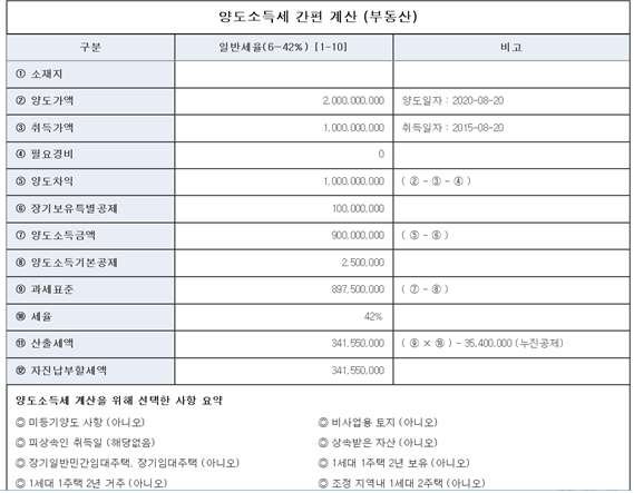 10억에 취득한 건물을 5년 뒤, 20억에 양도한다면 양도차익의 45% 정도를 양도소득세로 납부해야 합니다.
