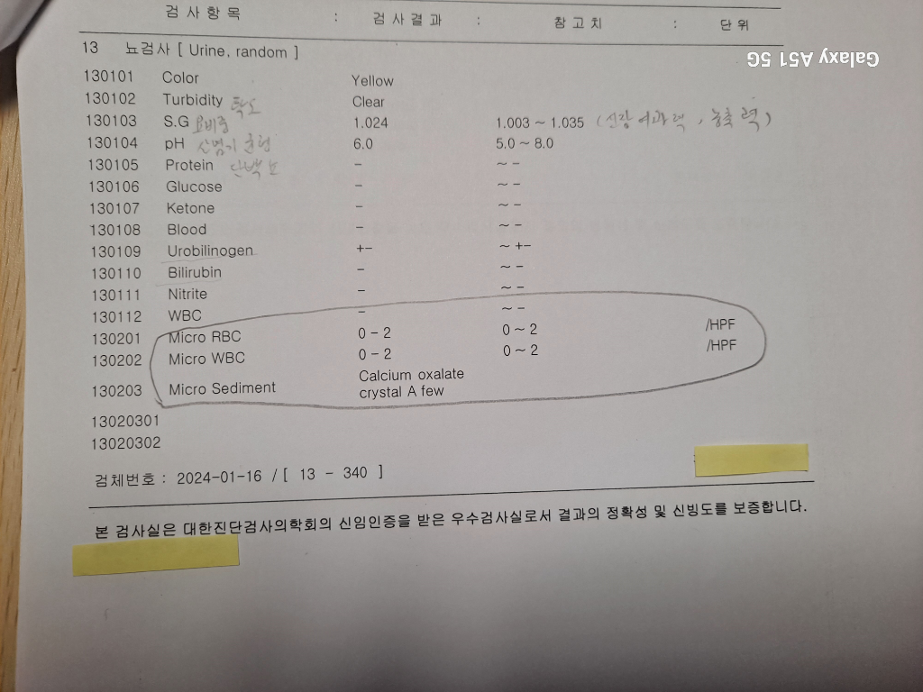 현미경으로 보았을 때 적혈구와 백혈구는 보이지 않아 정상인 상황이고, 수산화칼슘 결정체가 관찰되었는데 이것은 요로결석의 원인이 될 수 있으니 평소 물을 충분히 드시는게 좋겠습니다.
