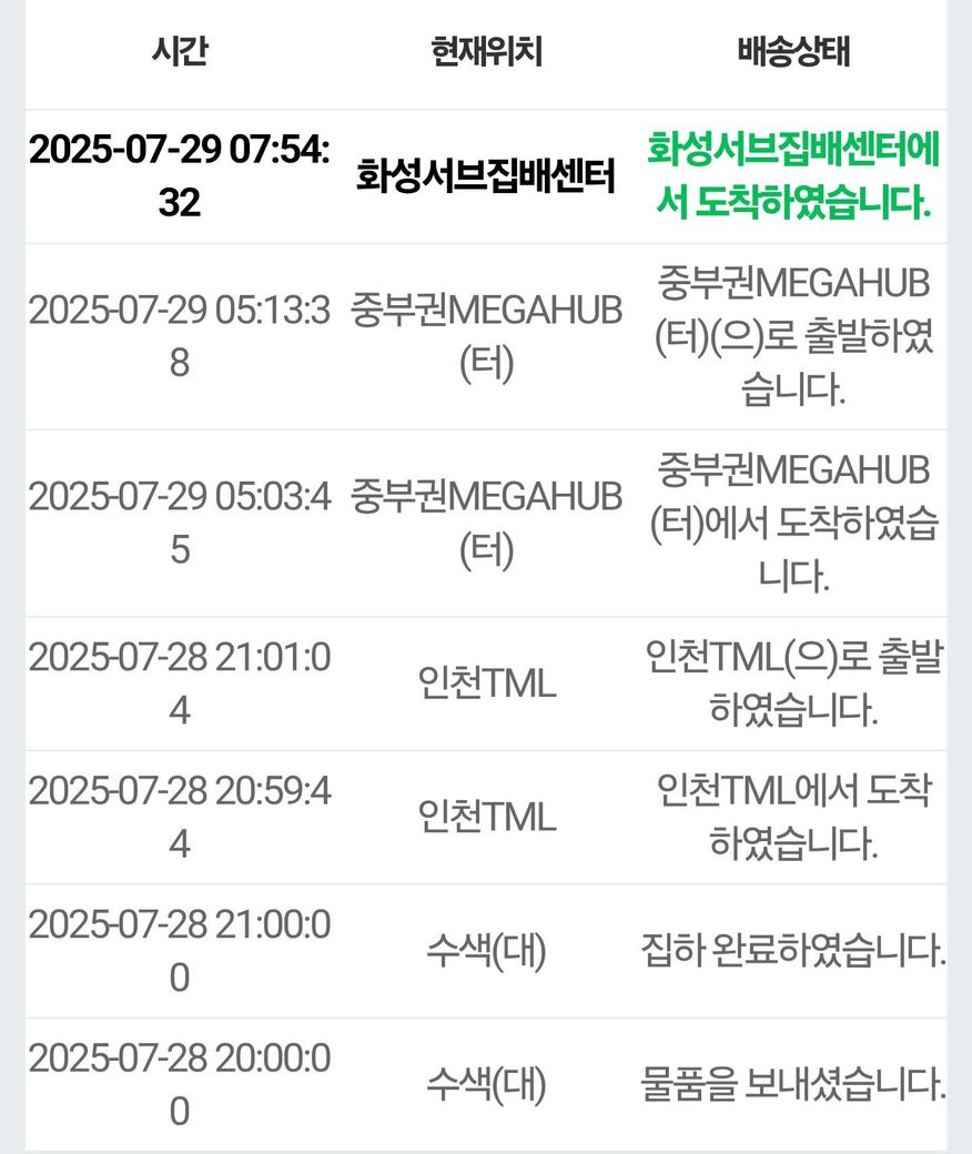 일단 화성에 위치한 서브집배센터까지 도착한 것을 보면