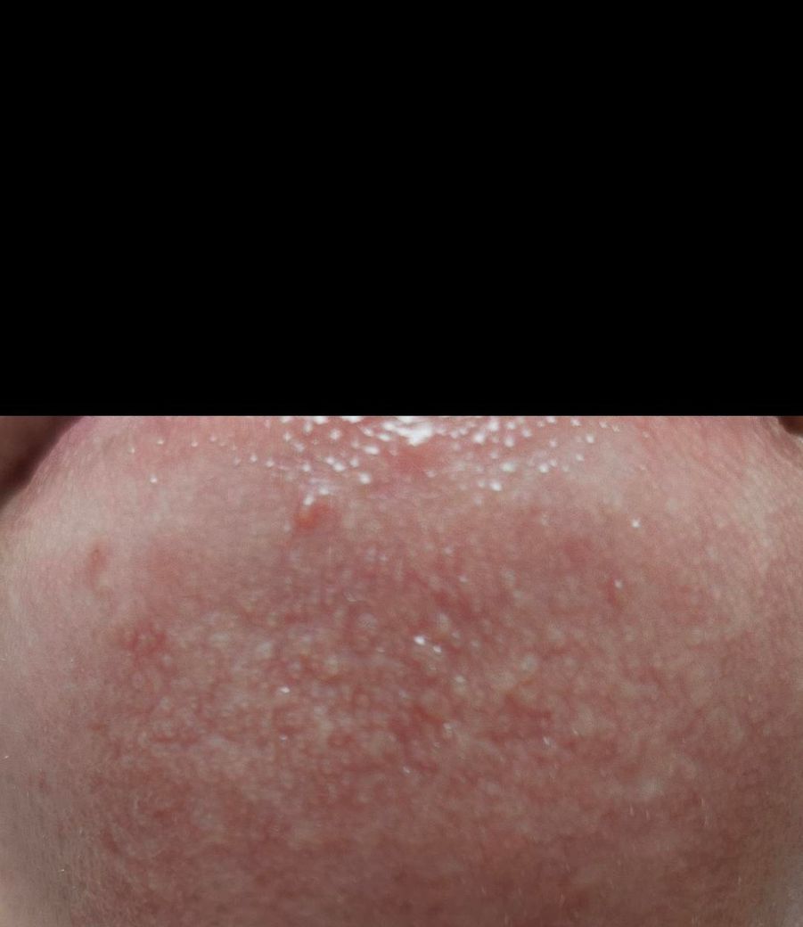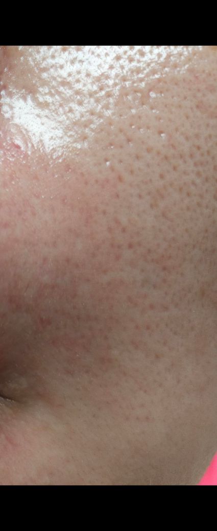 전체적으로 민감한 트러블성 피부이며 큰 트러블은 한번씩 올라오지만 얼굴 전체적으로 모공마다피지(화이트헤드) 분비가 활발한 상태입니다.