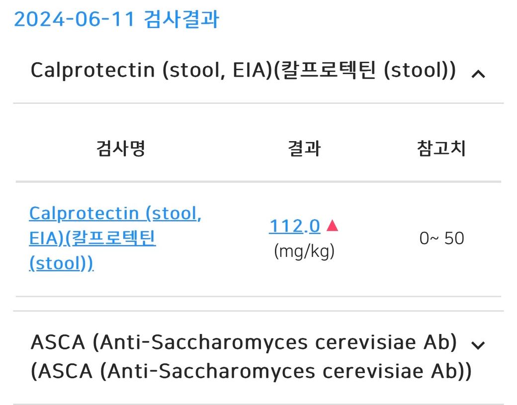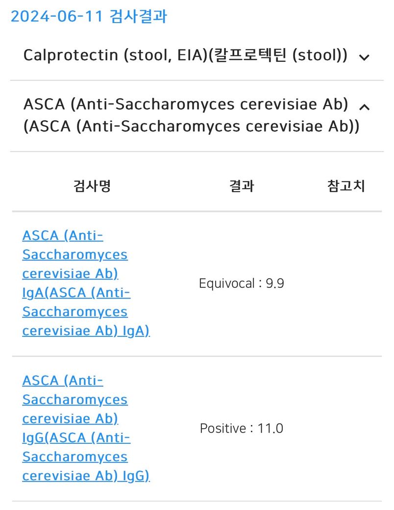검사 결과를 보면, ASCA (Anti-Saccharomyces cerevisiae Ab) 검사가 두 가지 형태로 진행되었습니다. 첫 번째 검사인 ASCA IgA는 'Equivocal: 9.9'로 나왔고, 이는 명확한 양성도 음성도 아닌 경계선에 있는 결과를 의미합니다. 두 번째 검사인 ASCA IgG는 'Positive: 11.0'로 명확한 양성 결과를 나타냅니다. ASCA 항체는 주로 크론병과 같은 염증성 장질환(IBD)에서 발견되며, 양성 결과는 이러한 질환의 가능성을 시사할 수 있습니다