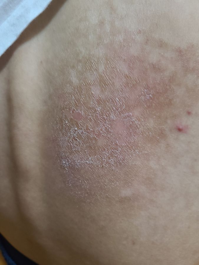 피부가 이렇게 색이 변하고 오돌토돌하게 거칠어졌습니다. 사진은 등 아래쪽 부분이구요. 팔 부분에도 비슷한게 생겼습니다.