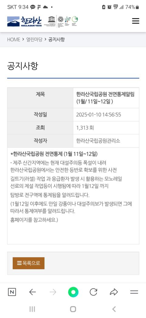 제가 12일에 한라산 영실코스를 갈 예정이였는데 사진처럼 통제된다고 공지가 올라왔더라구요..? 그러면 통제가 중간에 바뀔 일은 없나요?? 등산할 때 짐을 챙길지 말지 고민이 되서용