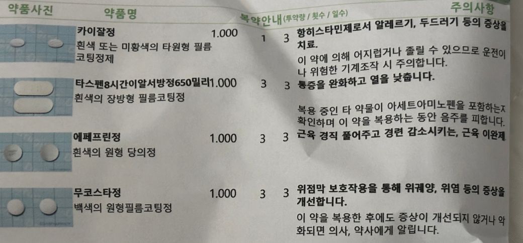 근이완제는 목이 좀 굳어서 받았고 진통제는 통증이 심해서 처방해주신거 같은데 알레르기약은 왜있는걸까요..?