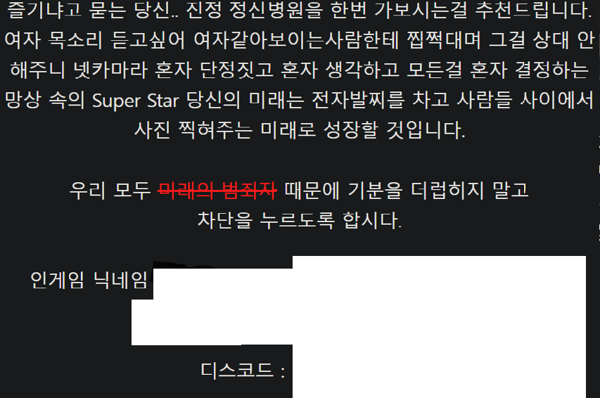 디스코드라는 프로그램에서 저는 아무런 성적 발언 등 하지 않았습니다. 찍쩝거린 적도 그에 대한 내용은 전혀 없구요