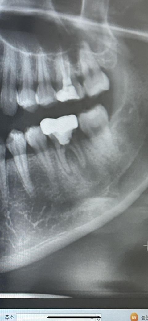 현재 염증이 심한 상태로 보이며, 이 경우에는 자연치아 보존이 어렵기에 발치후에 임플란트 치료를 권합니다.