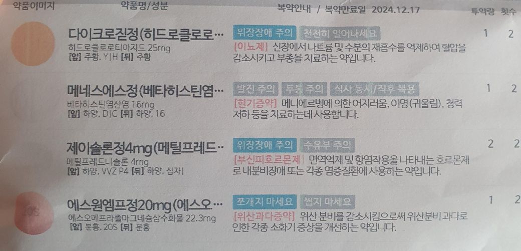 아버지가 갑자기 귀에 물찬듯이 소리가 울린다고 하셔서 이틀전에 소리전문병원에 갔습니다. 돌발성 난청을 진단 받았는데 사진처럼 약처방 받으셨습니다.