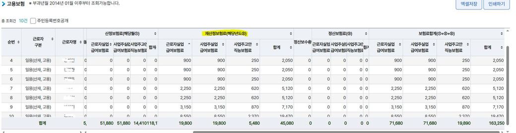 고용산재토탈에서 9월 부과 고용보험료를 열람했는데, 이렇게 일용소득자들의 재산정보험료가 고지됐는데,