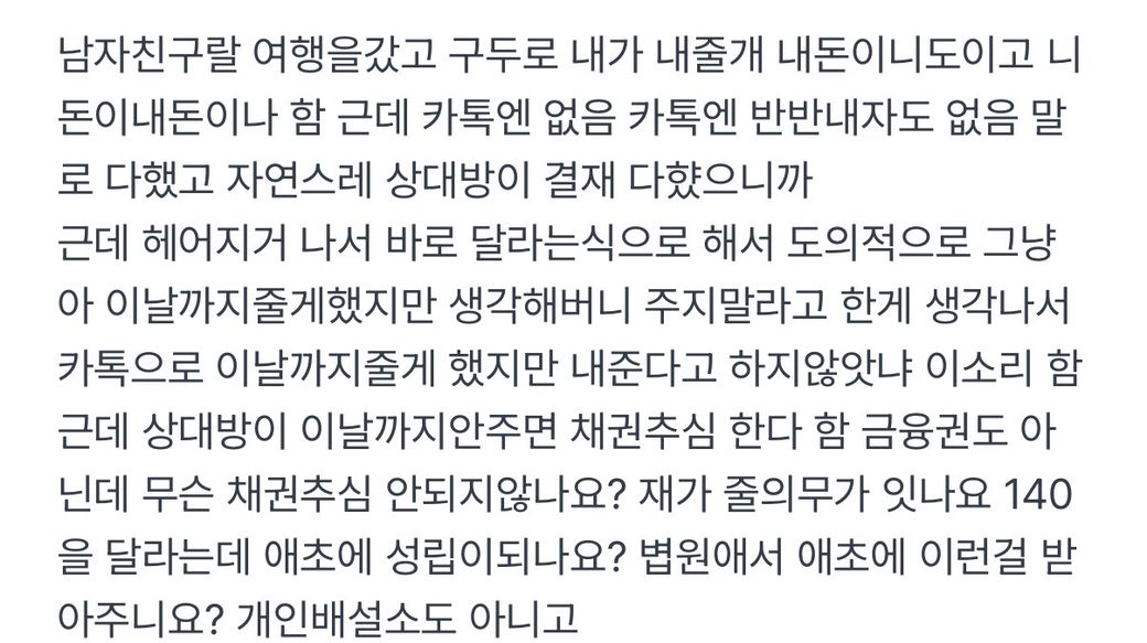 덧붙히자면 여기서 막상 12월31일까진 중다하엿지만 상황상 나눠서 준다고하면 상대방이 안댄다고 하면 저는 나눠서 못주고 그녕 한번애 줘야대나요? 민사소송을 햇을때 나눠서 준다고 해도안대나요???, 어처피 소송 오래걸리니까 전 3개월안에만줘도 주면 다끝나는내용아닌가요 주면 소송걸어도 바로 취소 대잖아요 어찌댓건 주면대는거잖아요