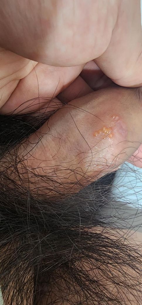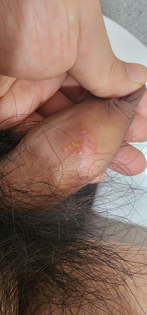 마지막으로 한건 토요일에 삽입은 하지 않고 구강 성교로만 했는데 오늘 아침에 확인해 보니 사진과 같은게 생겼습니다. 해당 위치는 이전에 여드름 같은 것이 생겼던 부위이고 현재 수포만 새로 발견 했습니다.