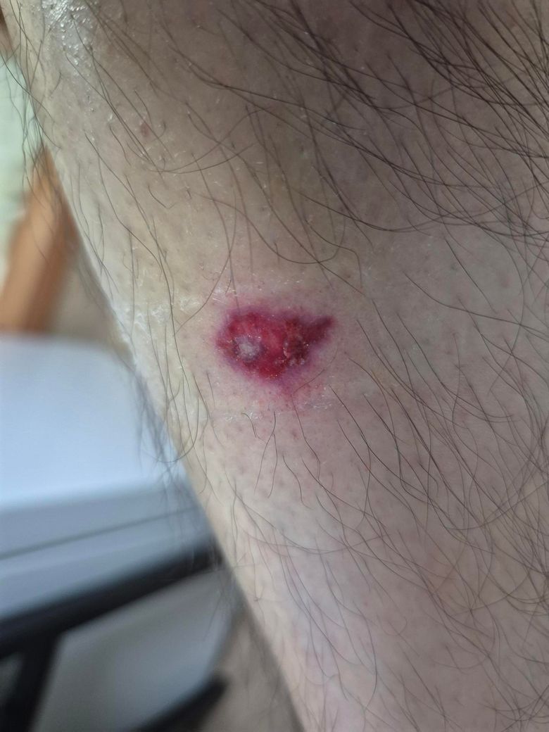 사진상 정강이 타박 후 피부가 파인 개방성 상처로 보이며, 가운데 하얀 부분은 삼출물·괴사 조직 또는 세균막일 가능성이 있습니다. 정강이는 혈류가 상대적으로 적어 치유가 느린 부위라 4일이 지나도 호전이 없고, 이미 항생제를 복용 중임에도 붉은기와 상처 정체가 보이면 단순 연고·밴드 반복만으로는 회복이 어렵습니다. 오히려 밀폐가 과도하면 감염이 악화될 수 있습니다.