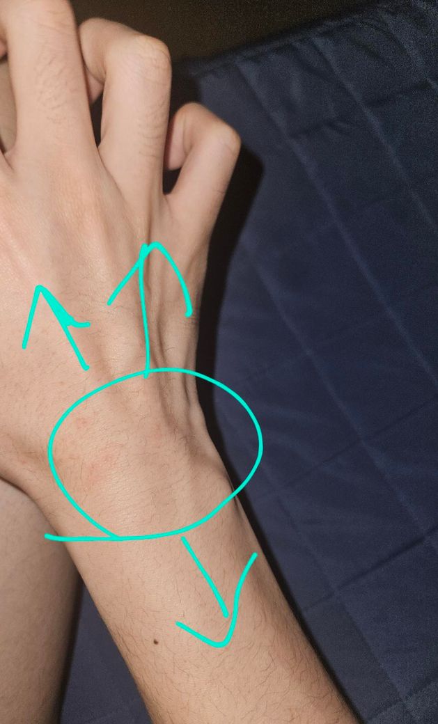 문제 부위가 2번째 사진이고 1번째(정상적인 제 왼손 사진)사진과 비교해보면 오른쪽 손등 인대부분이 굳은 건지 타이트 해진 건지