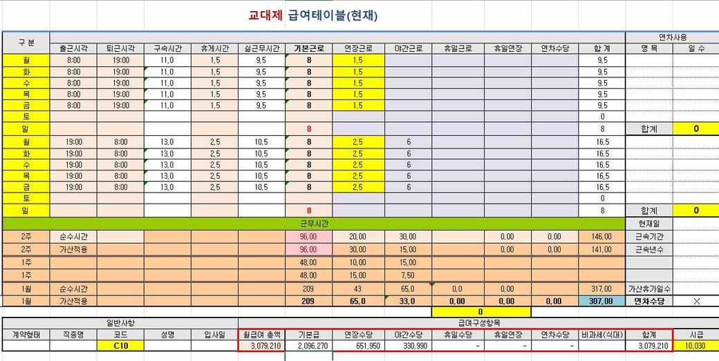 2교대 근무로 돌아가고있고 연장수당와 야간수당의 금액이 맞나요?