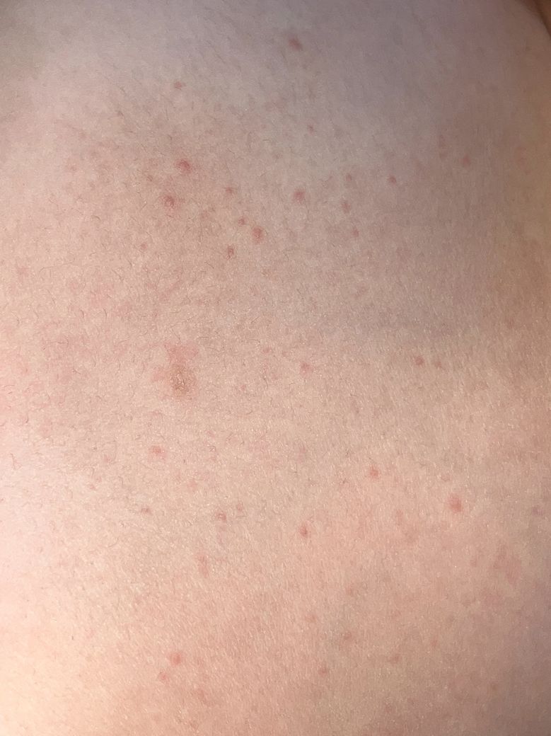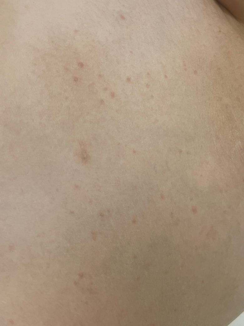 어제까지는 배 옆에 일부만 올라와서 신경 안 썼는데 오늘 갑자기 상체에만 사진과 같은 붉고 지름이 1~2mm정도되는 피부 발진들이 번져서 더 올라왔어요.