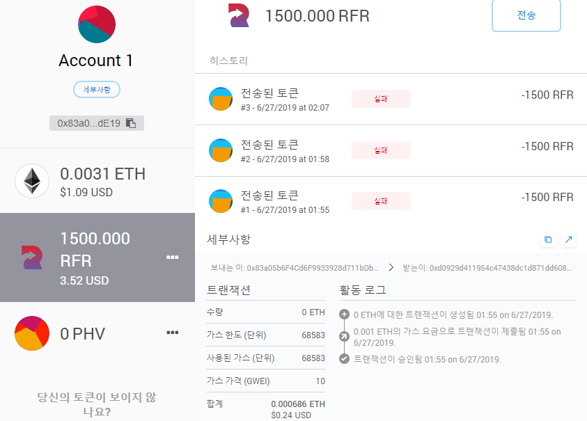 다른 코인들은 다 잘 가는데, 한 가지 코인이 계속 전송이 실패가 뜹니다.(리퍼리움)
