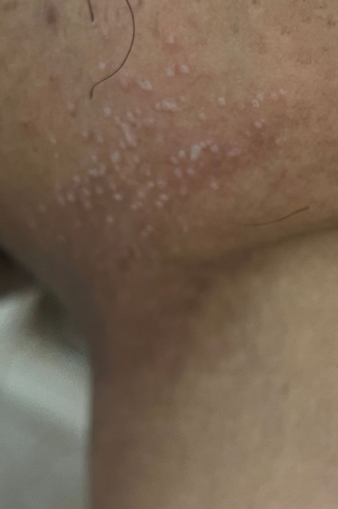 올려주신 사진상 작은 농포성 병변과 함께 주변 피부의 색소 침착이 관찰되고 있어 습진이나 완선과 같은 피부 질환 가능성이 높습니다. 곤지름은 농포성 병변으로 나타나기 보다는 사마귀 양상의 결절성 병변으로 나타나는 것이 일반적이기 때문입니다.