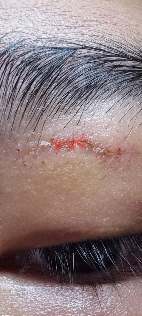 저 빨간색 세개의 원에 파란색이 조금 보이는데 제가 봉합할때 파란색 실을 썼거든요 그래서 뭔가 실밥이 남아있는것같습니다 살짝 간지럽기도 해요 그리고 흉터관리는 어떻게 해야하나요?