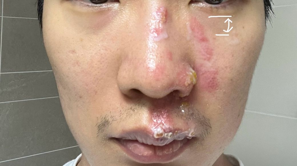 8월31일 : 우측 입술 / 우측 콧볼 / 우측콧잔등 에 수포가 나면서 우측 안면이 전체적으로 찌릿찌릿한 증상 생김