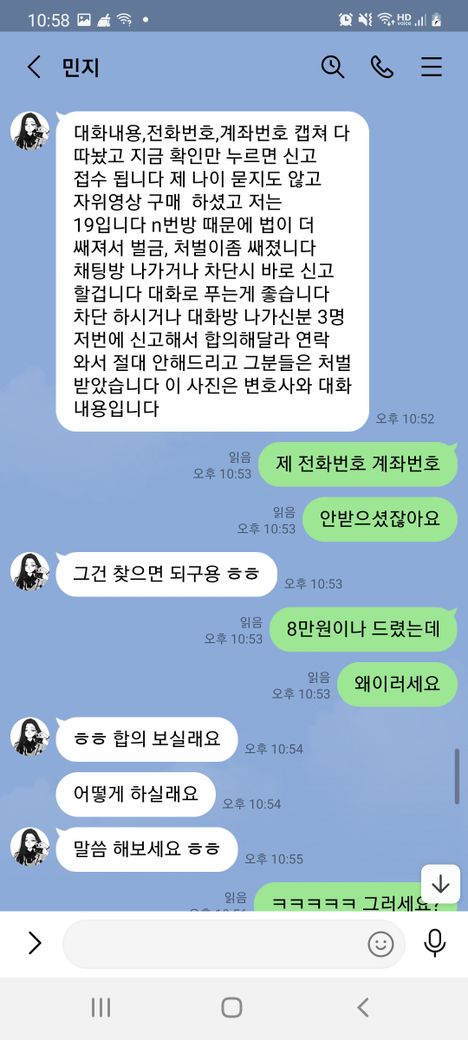 라인으로 성인영상을 구매하였고 3만원을 문상결제를해 보내주었으며 영상하나를 받았고 5만원 을추가로 문상결제하여 보내주었으나 갑자기 본인이 19살이며 아청법 음란물죄로 신고하겠다고 했습니다.